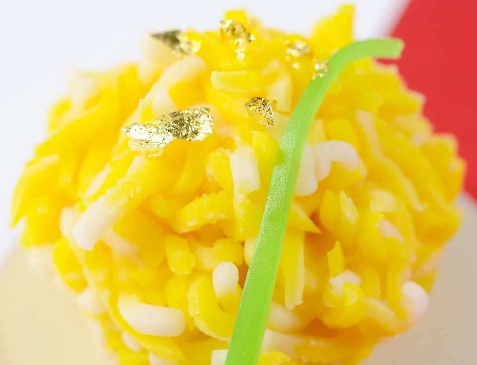 きんとん製、柚子餡と白ワイン餡で水仙を表現し、金粉を添えました。